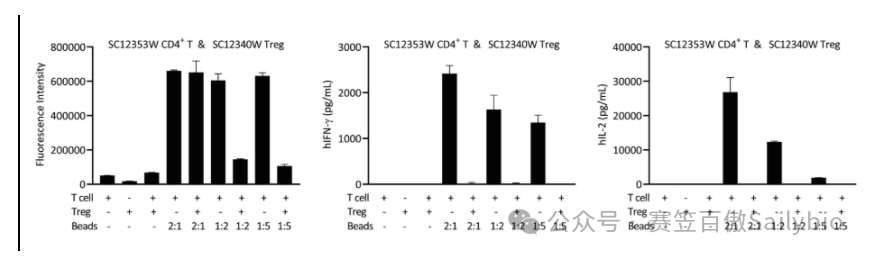 在不同浓度的XYbeads Human CD3/CD28 TCell Activation的刺激下,扩增的Treg可以明显的抑制CD4+ T细胞分泌IFN-γ及IL-2;